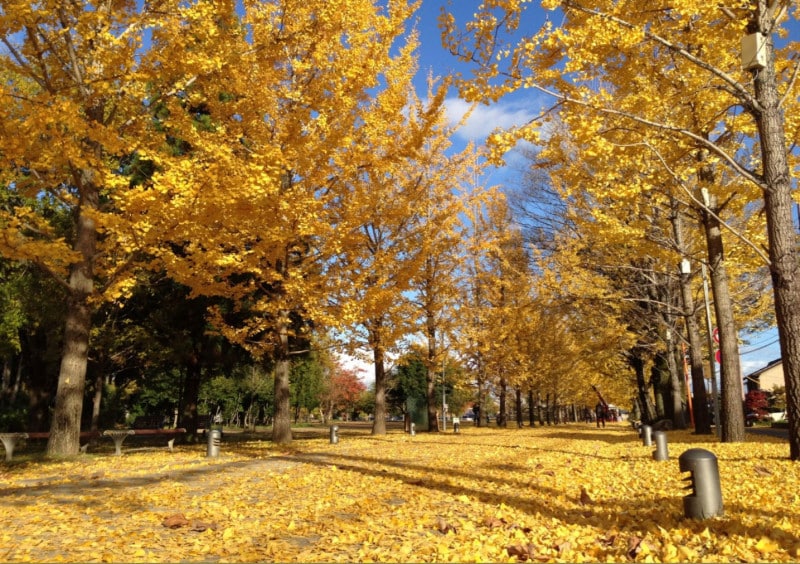 学びの森プロムナードのイチョウは例年11月中旬〜下旬にかけて黄金色に染まります。